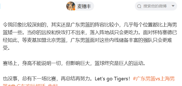 麦穗丰认为,广东队这场比赛就是输在了尺寸上:令我印象比较深刻的,其实还是广东男篮的阵容比较小,几乎每个位置都比上海男篮矮一些。当你的远投和快攻打不出来,落入阵地战只会更吃力。面对怀特塞德已经如此,等麦基加盟北京男篮,广东男篮面对这些内线储备丰富的强队只会更难受。赛场上,身高不能说明一切,但影响巨大,篮球终究是巨人的运动。