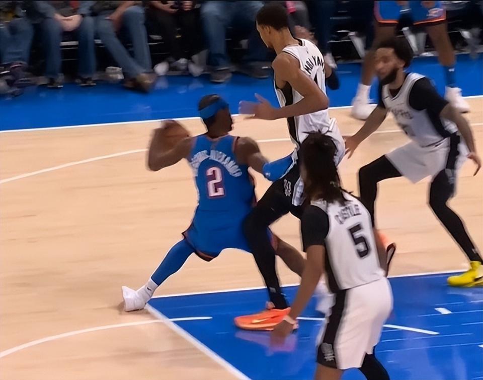 而且最离谱的是当时这个回合,裁判吹的竟然是没有犯规,本来亚历山大双腿是打开的,看到文班亚马抢到篮板了,故意把他小腿夹住,回过头来没吹雷霆犯规,接下来的回合竟然吹了马刺犯规?这才是真的奇葩。